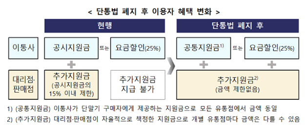 유통점의 추가지원금 상한(공시지원금의 15%)이 제거돼, 매장에서 금액 제한 없이 지원금 제공이 가능하고, 과거에는 불법으로 여겨졌던 페이백도 계약서에 명시하면 합법 허용됨