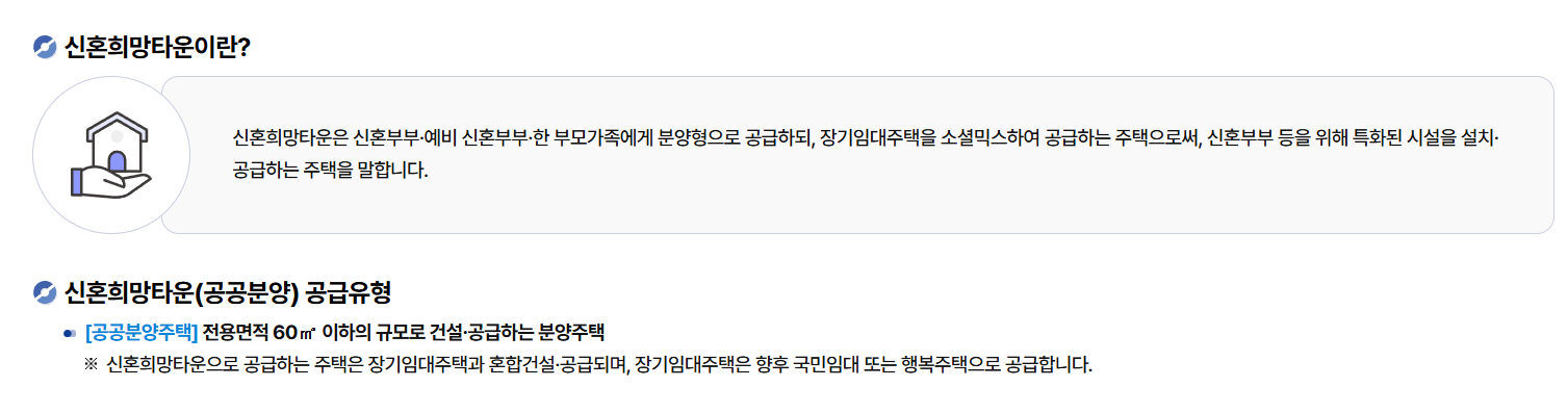 | 신혼희망타운 | 신혼부부 전용 공공분양주택, 전용 60㎡ 이하 소형, 저렴한 분양가 + 저금리 대출 지원 | 혼인 7년 이내 또는 예비신혼부부 |