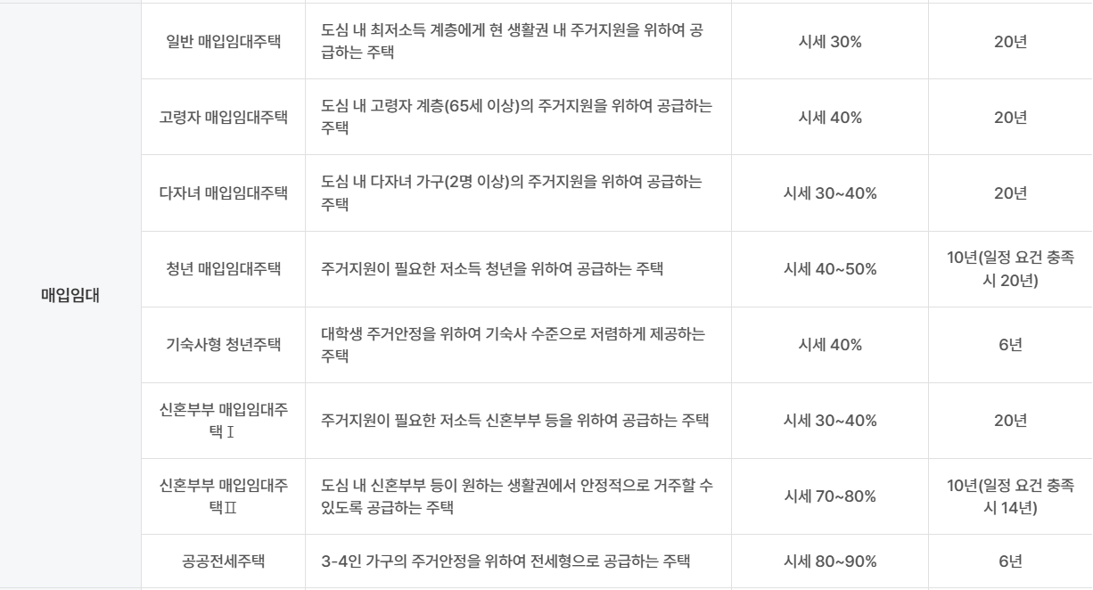 | 매입임대주택 | 저소득층, 청년, 신혼부부, 다자녀, 고령자 등 | 시세의 30% 수준 LH가 기존 주택을 매입해 저렴하게 임대 | 2년 단위 갱신 |