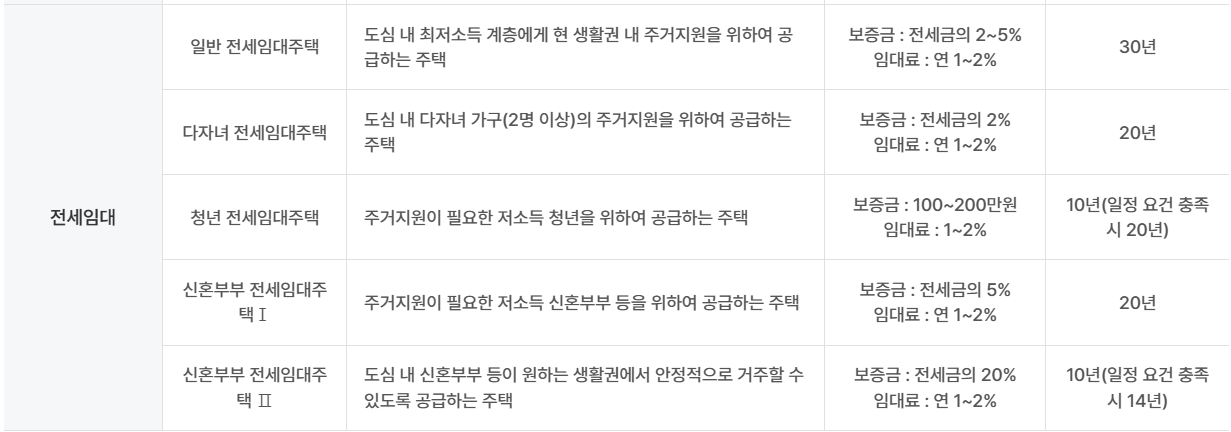 | 장기전세 | 무주택세대구성원 | 전세 시세의 80% 수준 | 20년의 범위에서 전세 계약 |