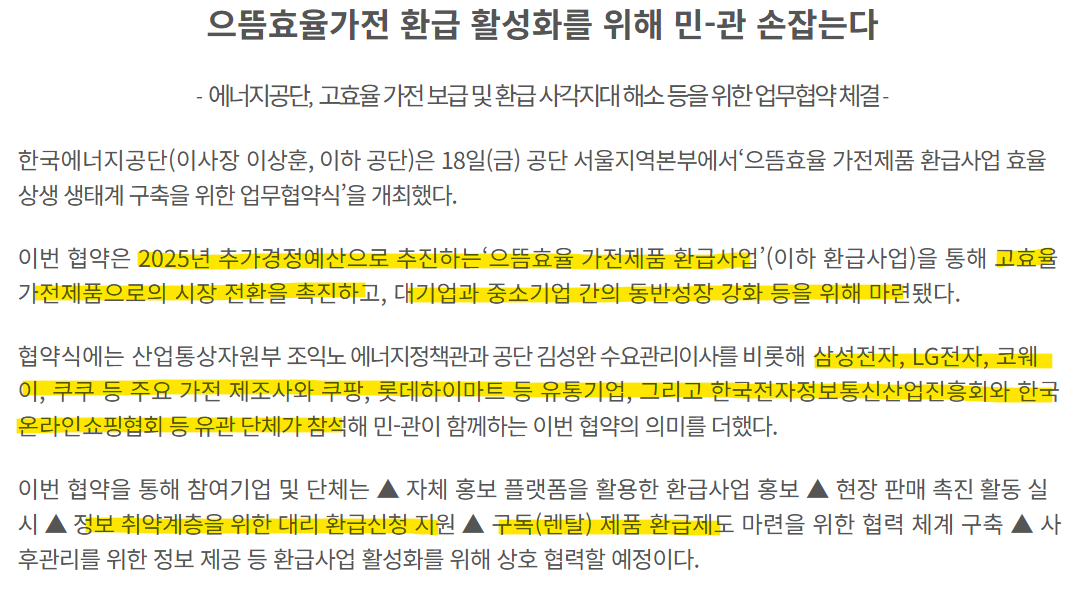 [출처] 한국 에너지 공단 "으뜸효율가전 환급 활성화를 위해 민-관 손잡는다"