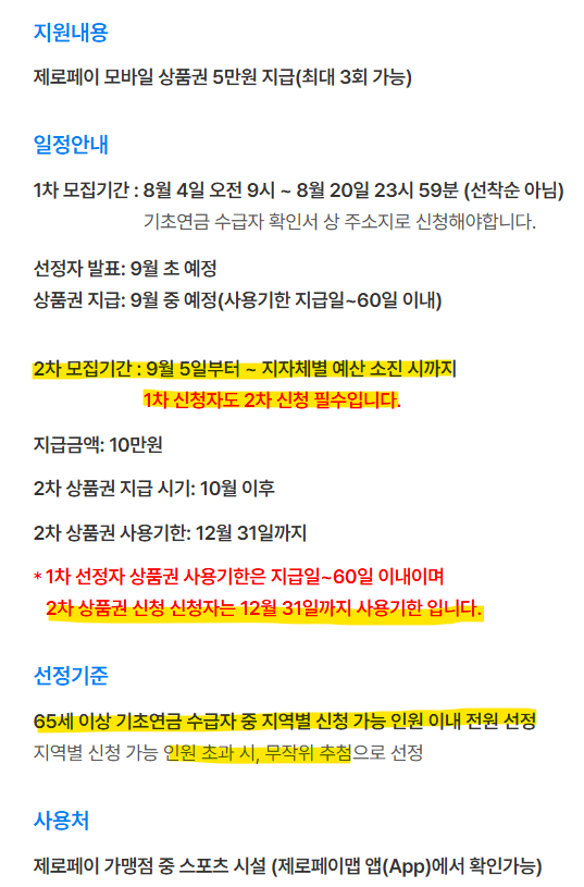 - 사용 가능 시설: 제로페이 가맹 체육시설(헬스장, 수영장, 스크린골프 등)에서 스포츠 강좌 또는 1회 이용료로 사용 가능