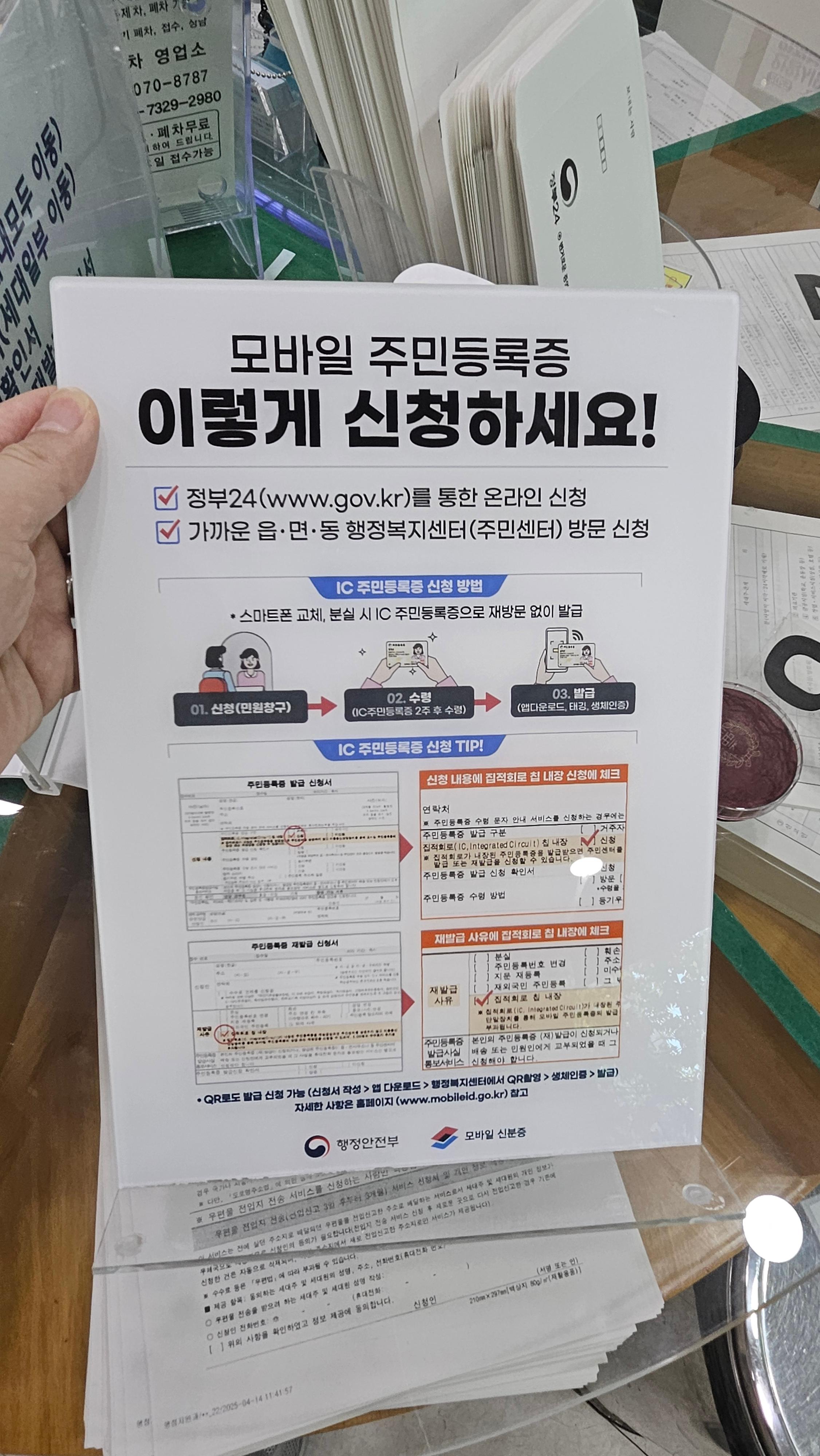 최근 주민등록증 갱신을 위해 방문한 행정복지센터에서는 모바일 주민등록증을 만드는 방법을 안내하고 있었다.