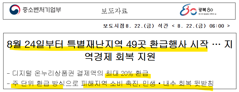 자료출처 : 중소벤처기업부, "보도자료, 8월 24일부터 특별재난지역 49곳 환급행사 시작 … 지역경제 회복 지원"