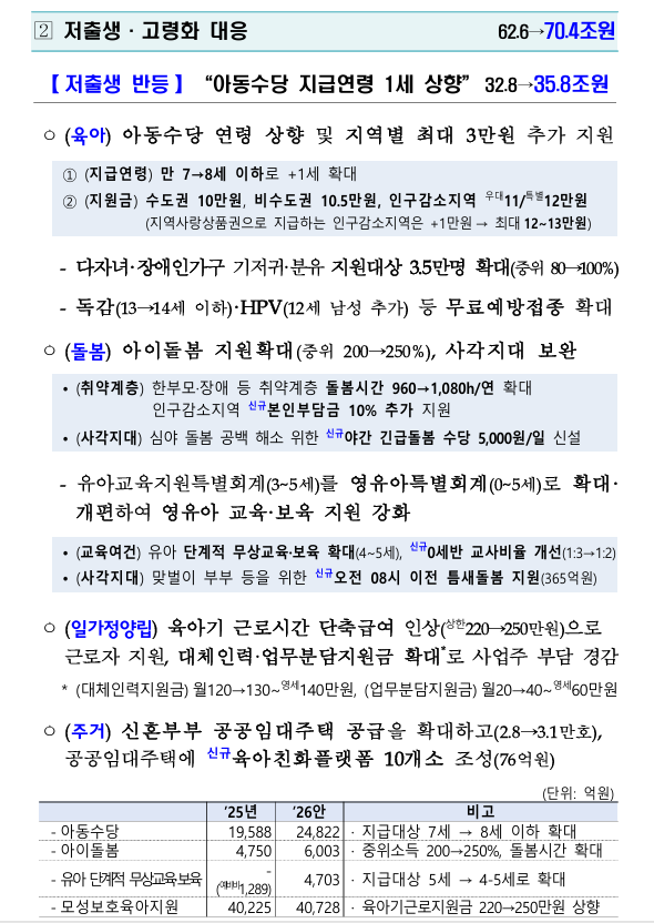| 보육·교육 지원 | 기초생활보장·교육급여 등 확대, 육아 부담 완화 | |