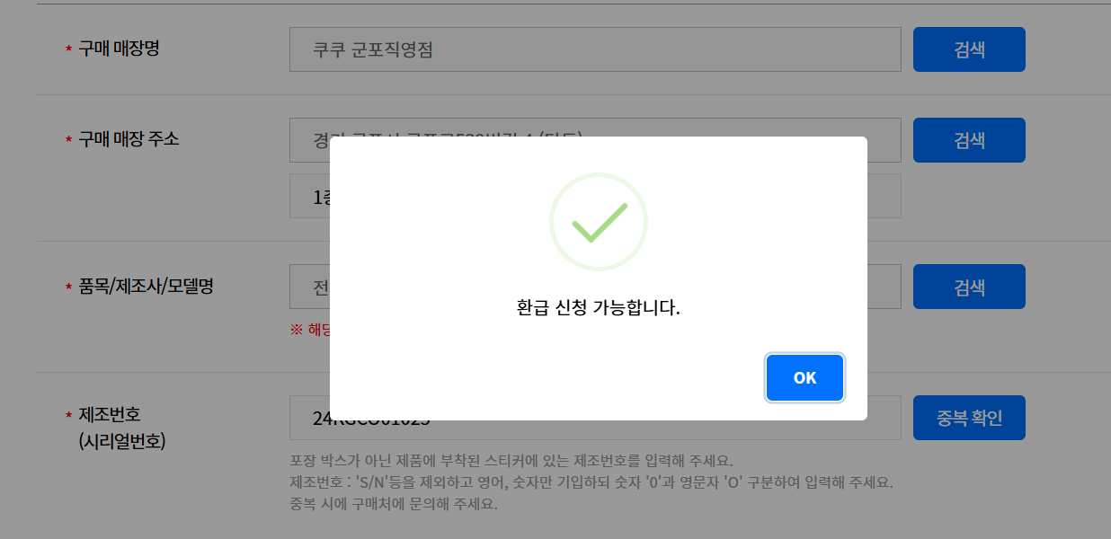 * 제가 구매한 쿠쿠 밥솥은 환급가능품목이지만, 구매일이 25년 7월 4일 이전이어서 신청 불가!